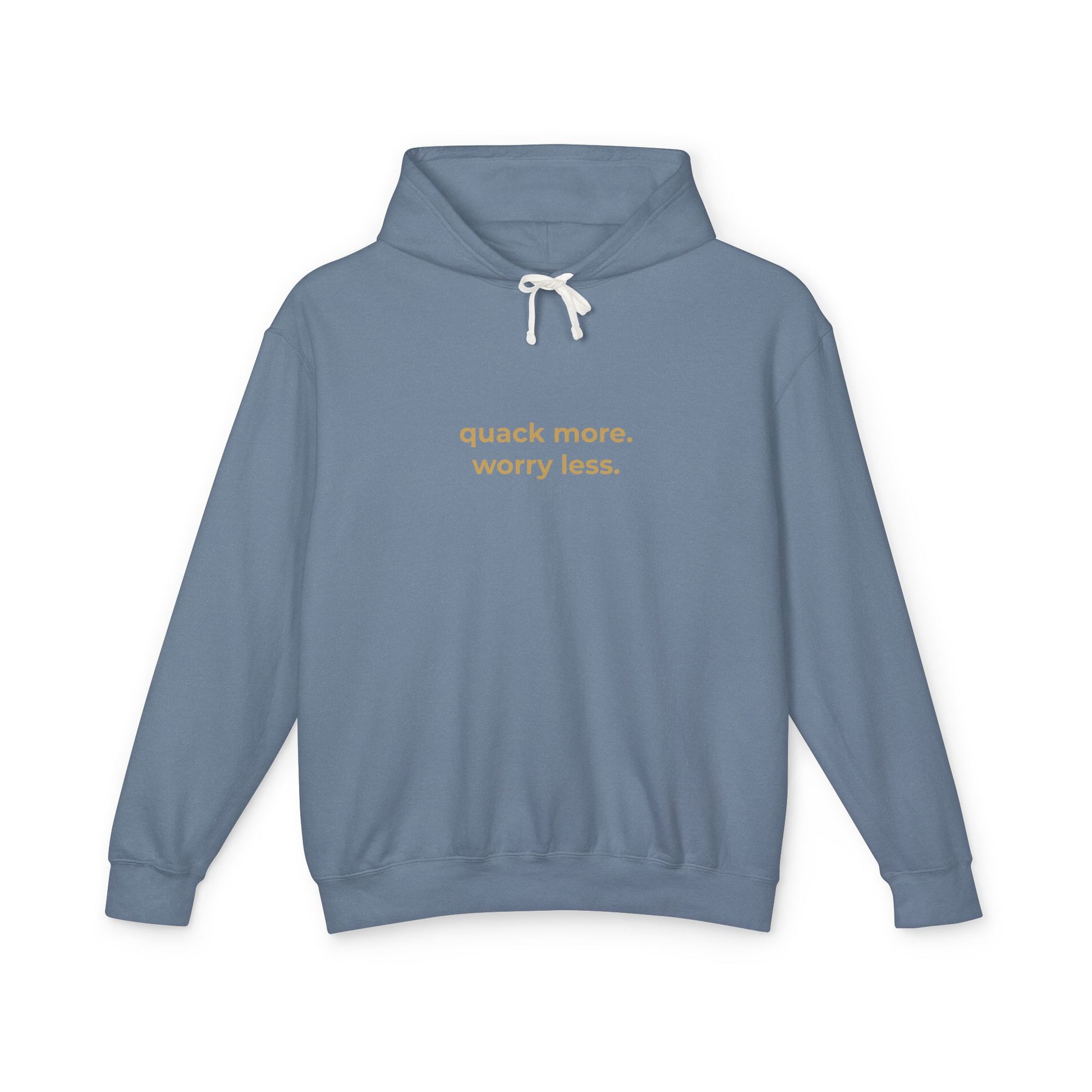 Meet the signature hoodie of Quack More — a soft, midweight, garment-dyed Comfort Colors favorite designed for cozy, everyday wear. Featuring our classic Quack More, Worry Less motto in warm gold lettering across the front and a subtle gold duck foot placed by the hood on the back, this piece brings softness, character, and a little whimsy to any day.
